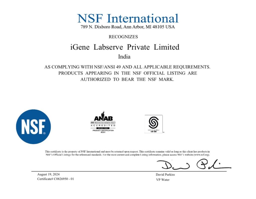 For a company manufacturing biosafety cabinet since long, the certification was long pending and the achievement marks a significant step forward. From the customer’s standpoint, choosing an NSF-certified product may mean that it complies with stringent procedures and standards imposed by National Sanitation Foundation. However, the certification has not come easily and it took them years to era the acclaim. Thanks that the team’s hard work have finally paid off. The biosafety cabinets manufactured by IGene Labserve will now have the NSF certification mark and demonstrate that they have been tested by one of the most revered and independent product testing organizations.